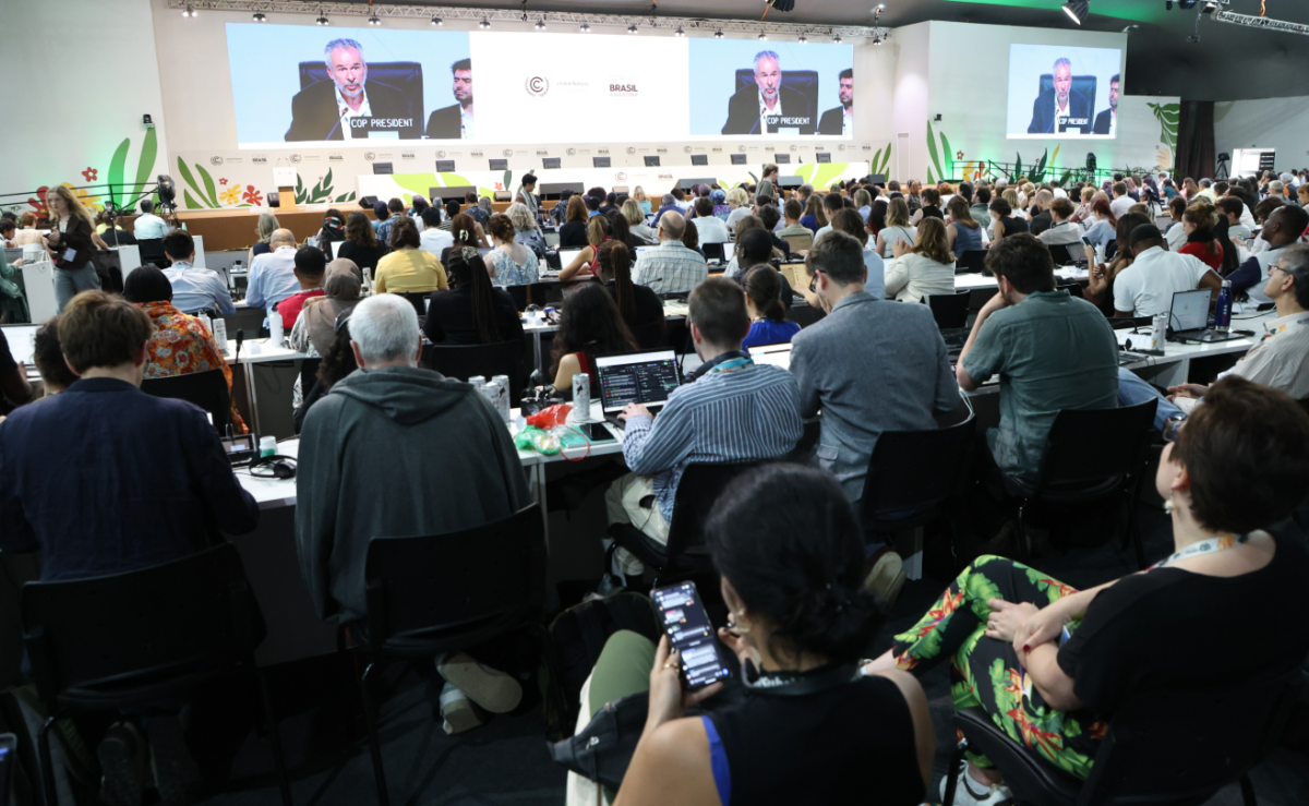 聯合國氣候峰會最終協議草案文本刪除逐步淘汰化石燃料路線圖引發歐盟與油國對槓,歷經徹夜磋商後,於23日中午終於舉行全體閉幕會,COP30峰會主席柯利亞逐一敲槌宣讀最終文本,媒體仔細聆聽開會過程。特派記者潘俊宏/巴西攝影