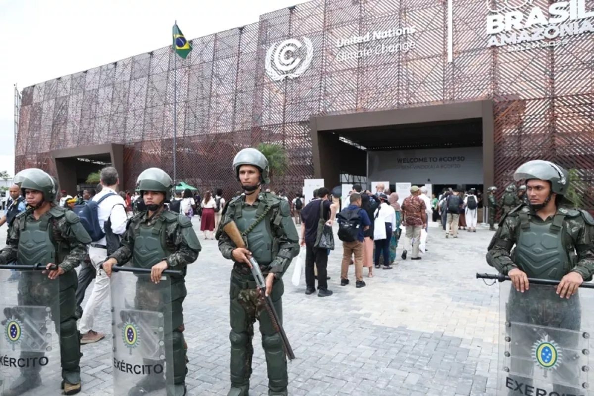 氣候峰會今天一早就有原住民及環團到入口處抗議,巴西軍警立即封鎖現場並強力排除,隨後排成一排警戒並維護入場秩序。記者潘俊宏/攝影