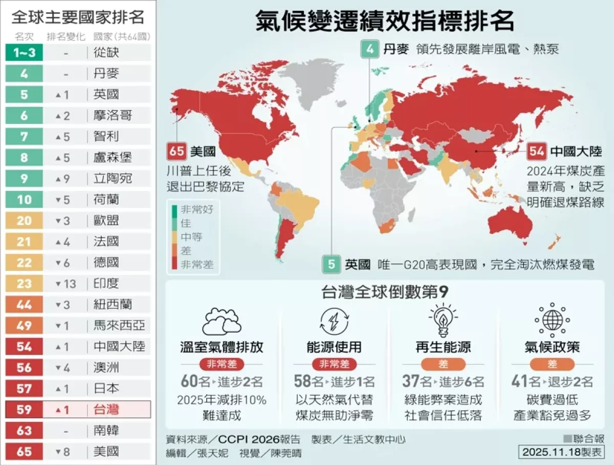 聯合國第卅屆氣候峰會(COP30)正在巴西舉行,德國看守協會(Germanwatch)等組織昨發布全球「氣候變遷績效指標」(CCPI)二○二六版,台灣從去年六十名,微幅進步到五十九名,但仍屬於「非常差」(Very Low)等級,其中分項評比溫室氣體排放及能源使用為「非常差」,而再生能源和氣候政策則為「差」。