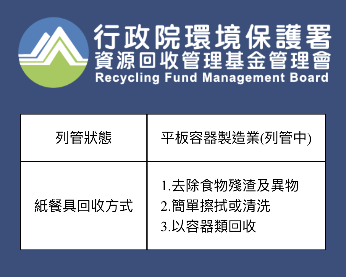 環保署為了鼓勵紙容器回收,設有「回收基金」機制,先對紙容器製造、進口商徵收費用,藉此補貼回收商、處理商,成為業者進行紙容器回收再利用的誘因。